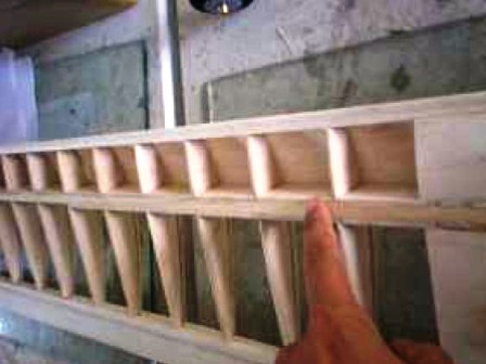 | Tanpa menggunakan lem letakan rib berikut ditempatnya secara berurutan, rekatkan rib pada spar juga tempatkan potongan rib pada rib tengah sebagai pengganjal. |